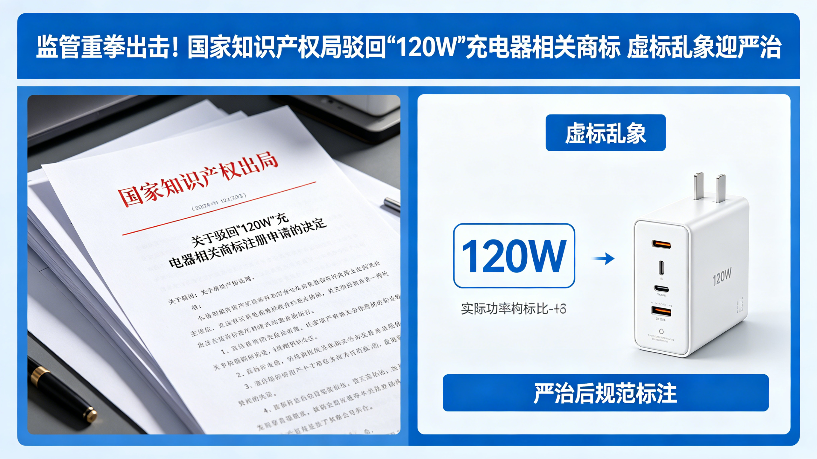 近日,国家知识产权局正式驳回多件与 “120W” 相关的充电器商标注册申请,核心原因在于该表述易使公众对充电器实际功率产生严重误认,违反《商标法》相关规定。这一举措标志着监管部门对充电器功率虚标乱象的治理进入新阶段,为消费者权益筑牢保护屏障。